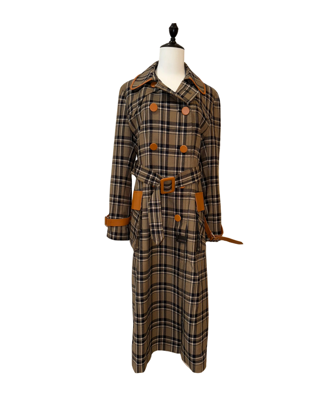 格紋羊毛長風衣 皮扣點綴顯精緻