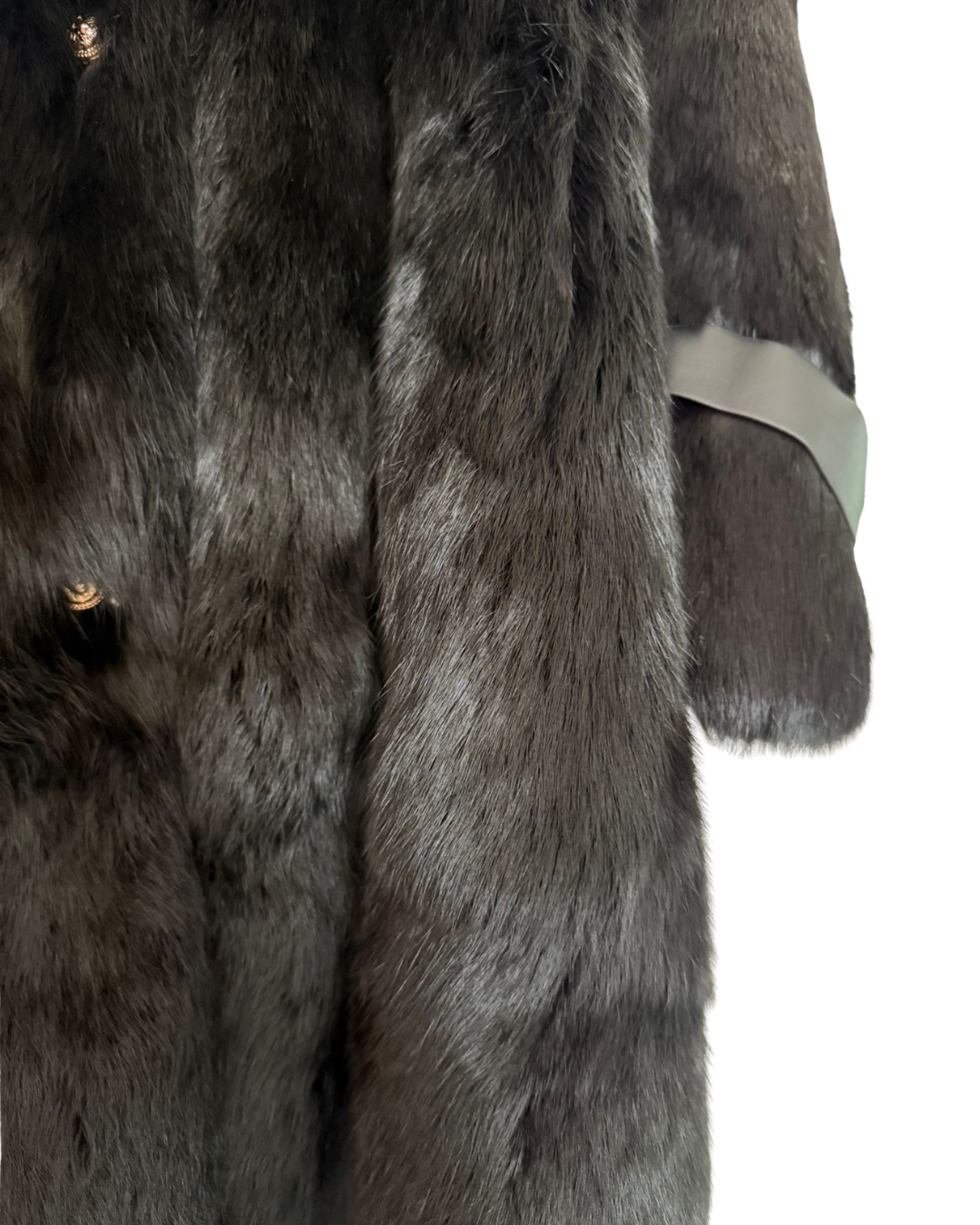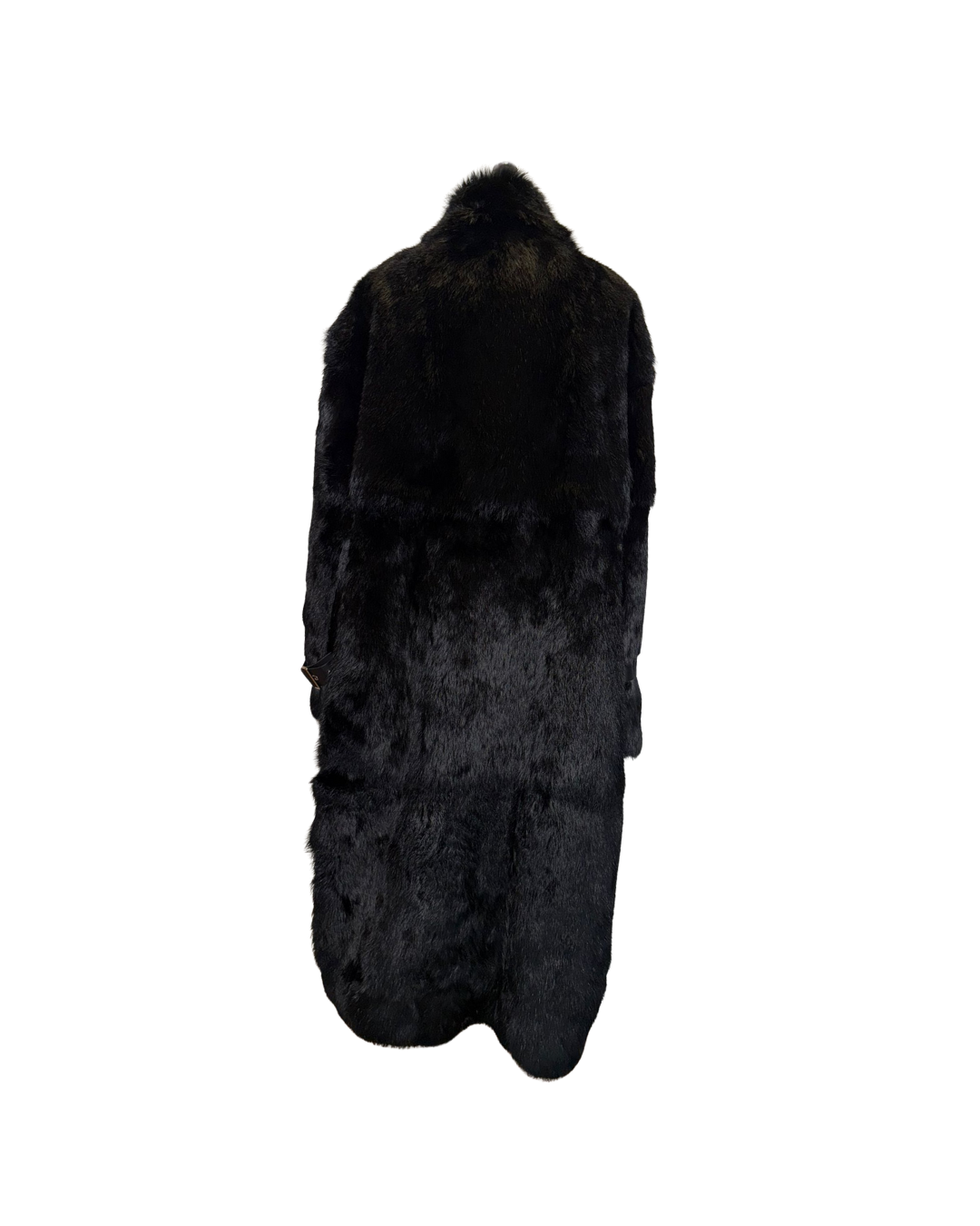 秋冬必備「兔毛長大衣」!選用高級兔毛製成,質地豐盈柔軟,保暖性與奢華感兼具。時尚的黑色搭配皮革裝飾和金色鈕扣,打造出醒目精緻的造型。長款設計增添優雅氣質,修身剪裁凸顯身形曲線,讓你保暖又時髦。
