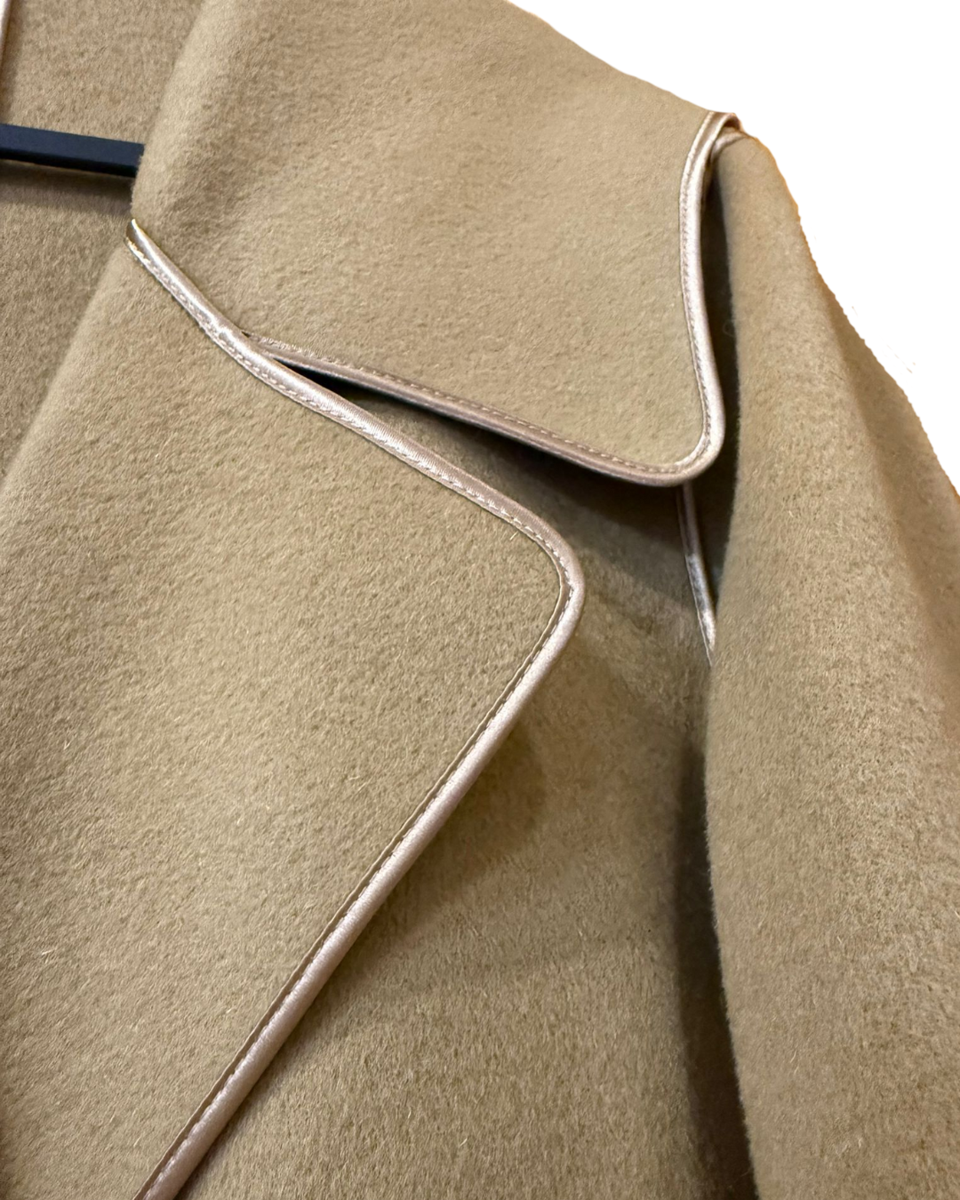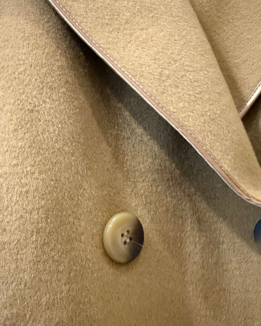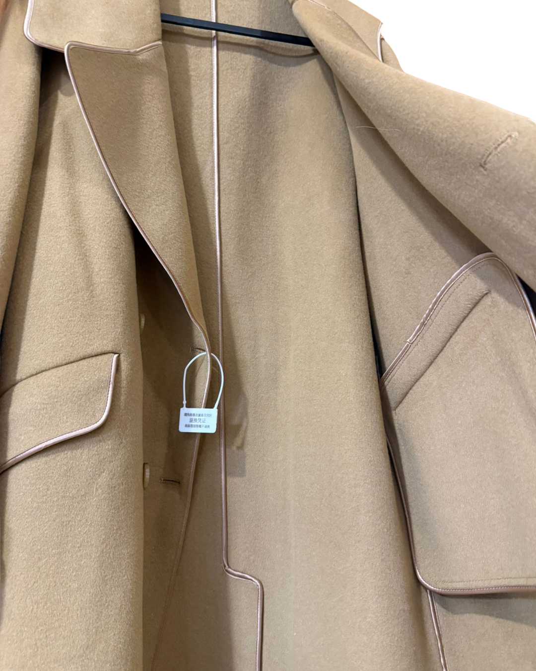 這是一件 100% 羊毛大衣,採用醋酸包邊工藝,實物呈卡其色。大衣整體設計精緻,羊毛材質柔軟舒適,醋酸包邊增添了質感與細節美,卡其色經典百搭,無論是日常出行還是正式場合都很適合穿著。