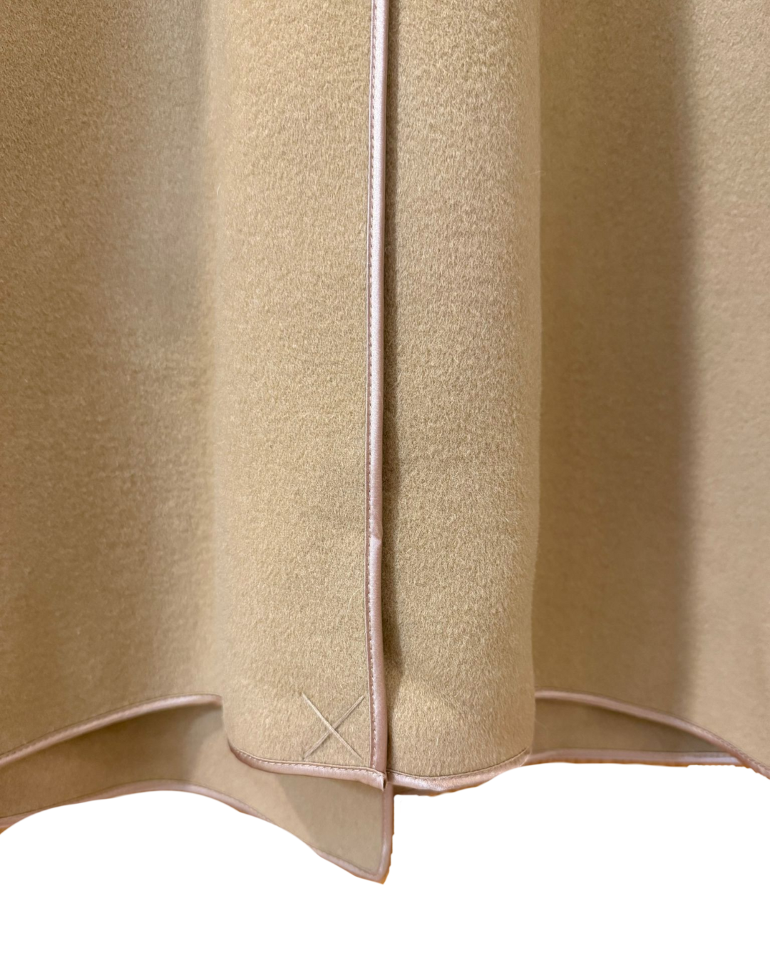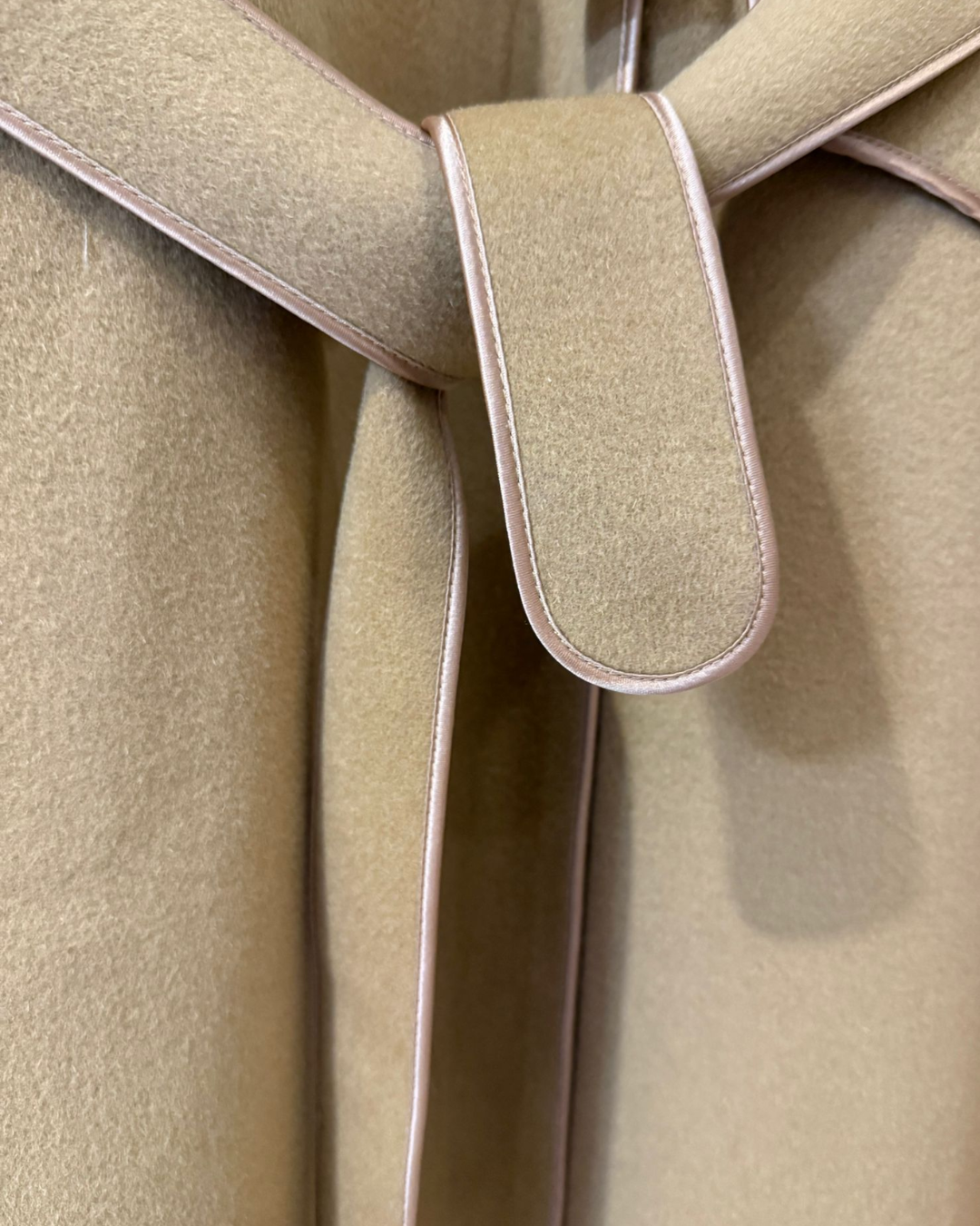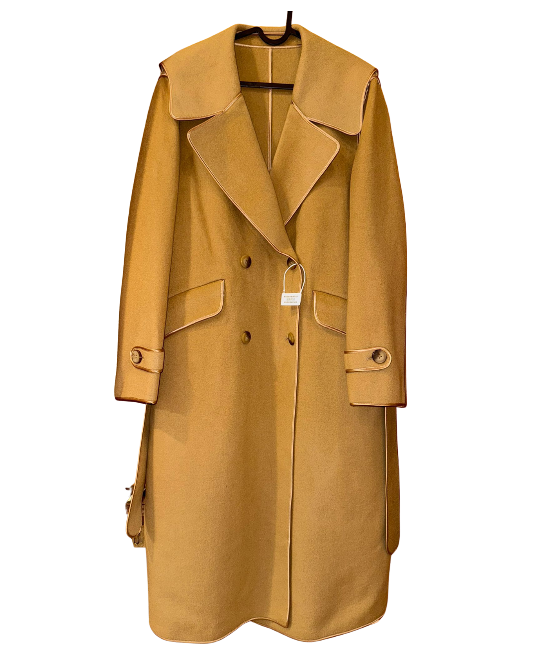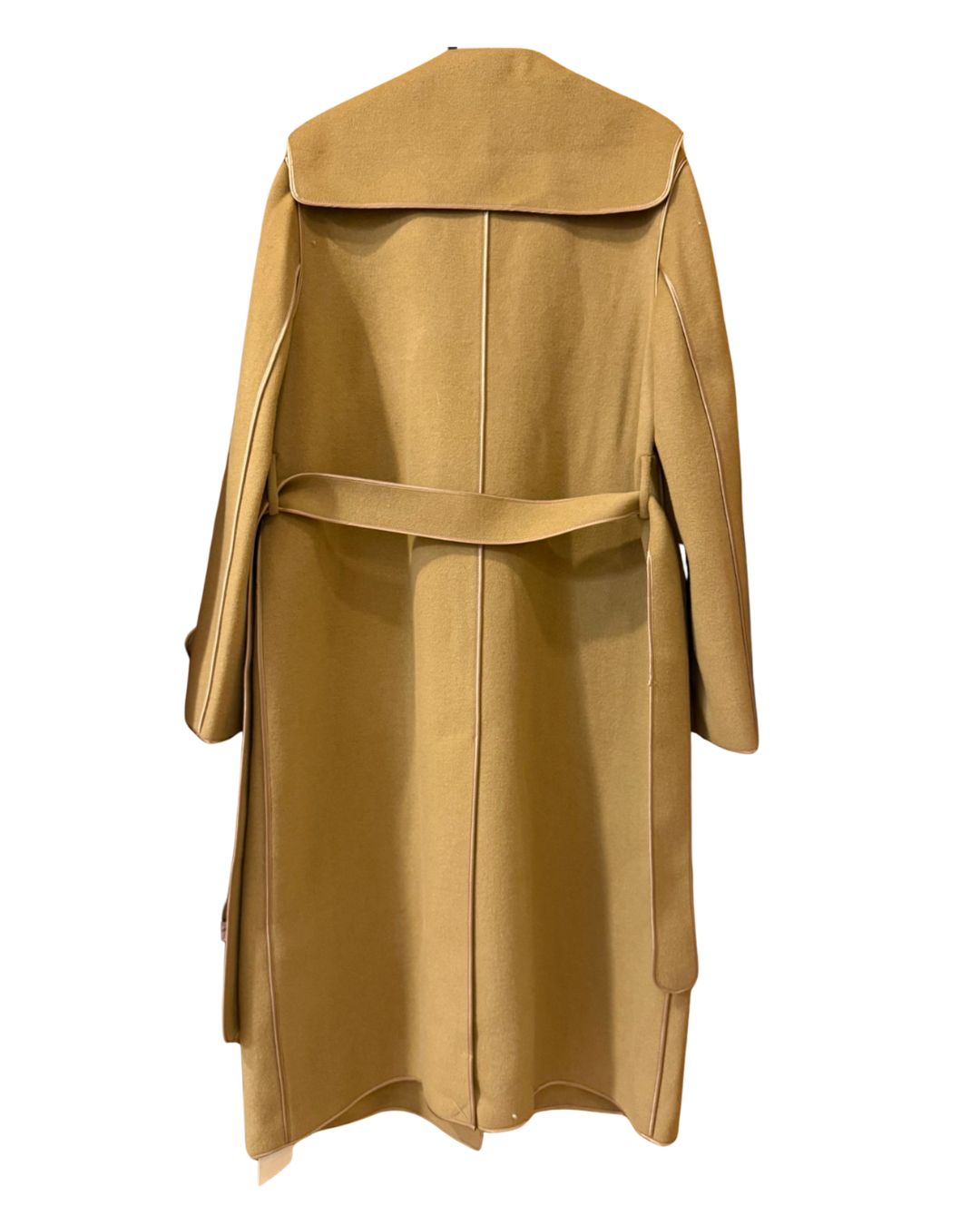 這是一件 100% 羊毛大衣,採用醋酸包邊工藝,實物呈卡其色。大衣整體設計精緻,羊毛材質柔軟舒適,醋酸包邊增添了質感與細節美,卡其色經典百搭,無論是日常出行還是正式場合都很適合穿著。