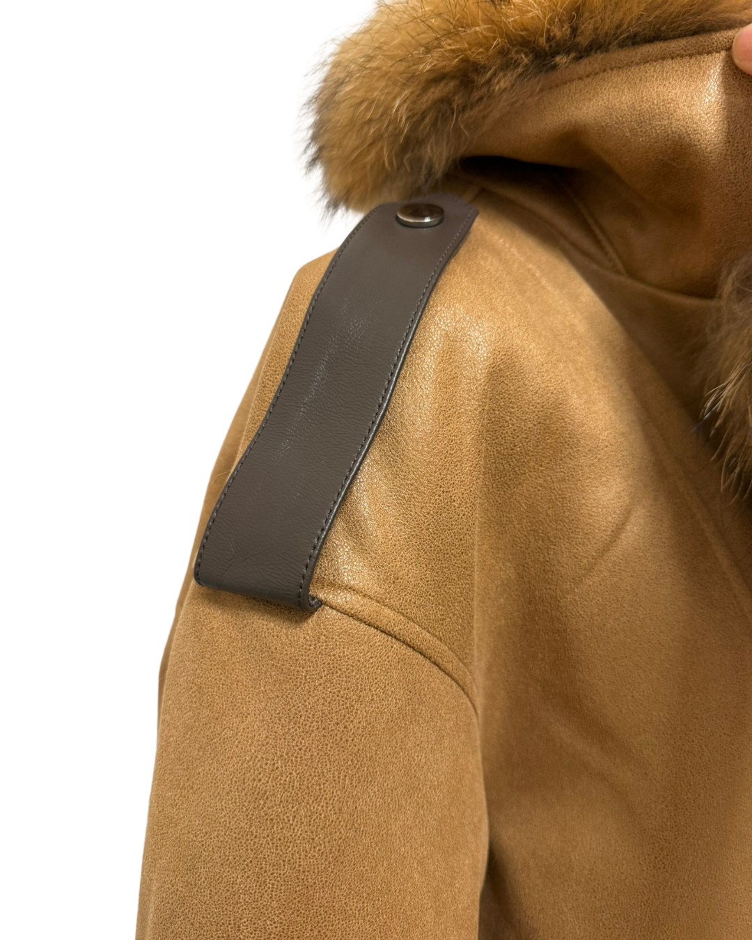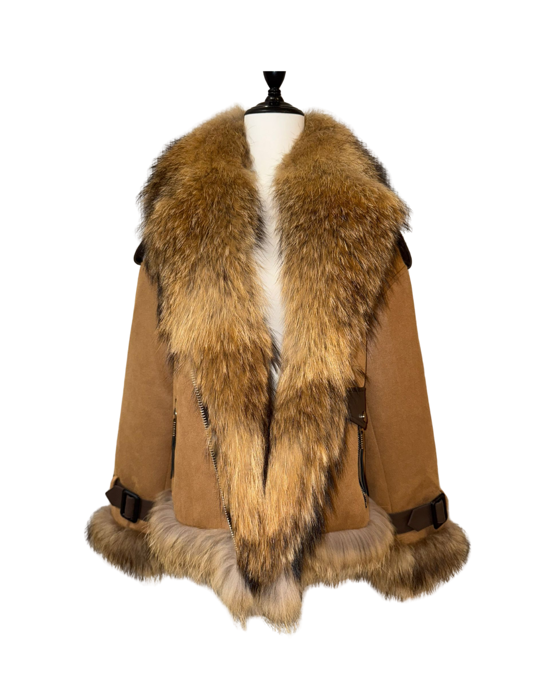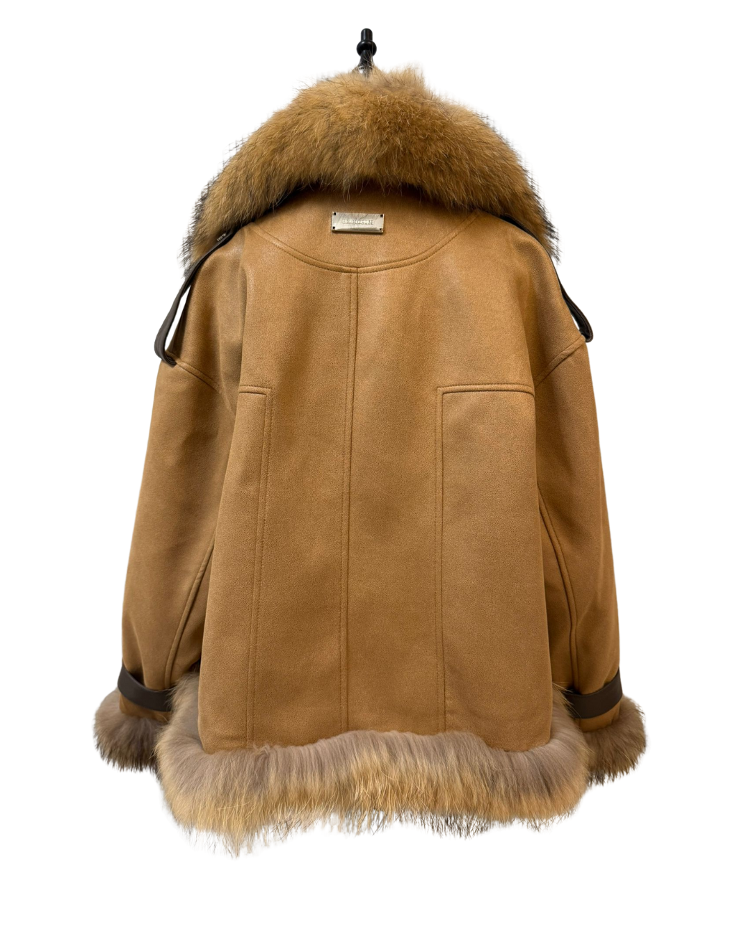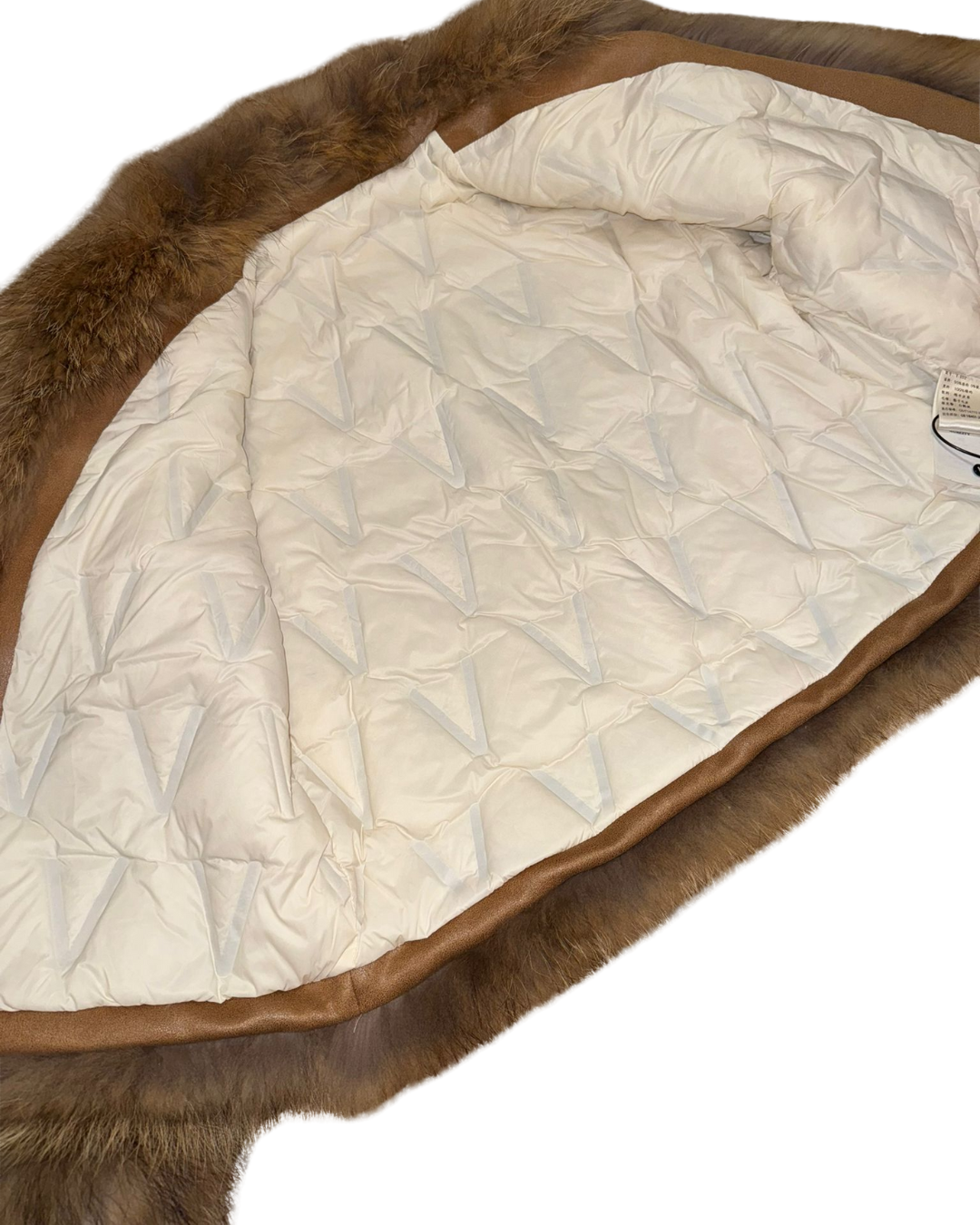 這是一件配備大貉子毛領的白鵝絨外套,採用全定位白鵝絨填充,並配有綿羊皮肩帶與手帶。它的胸圍為 100cm,長度 66cm,肩寬 43cm,袖長 55cm,重量 0.98 公斤。整體設計時尚保暖,毛領奢華大氣,羊皮配件增添質感,是冬日禦寒又能展現時尚品味的優質選擇。
