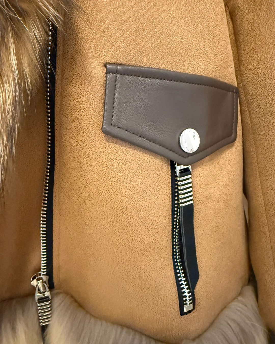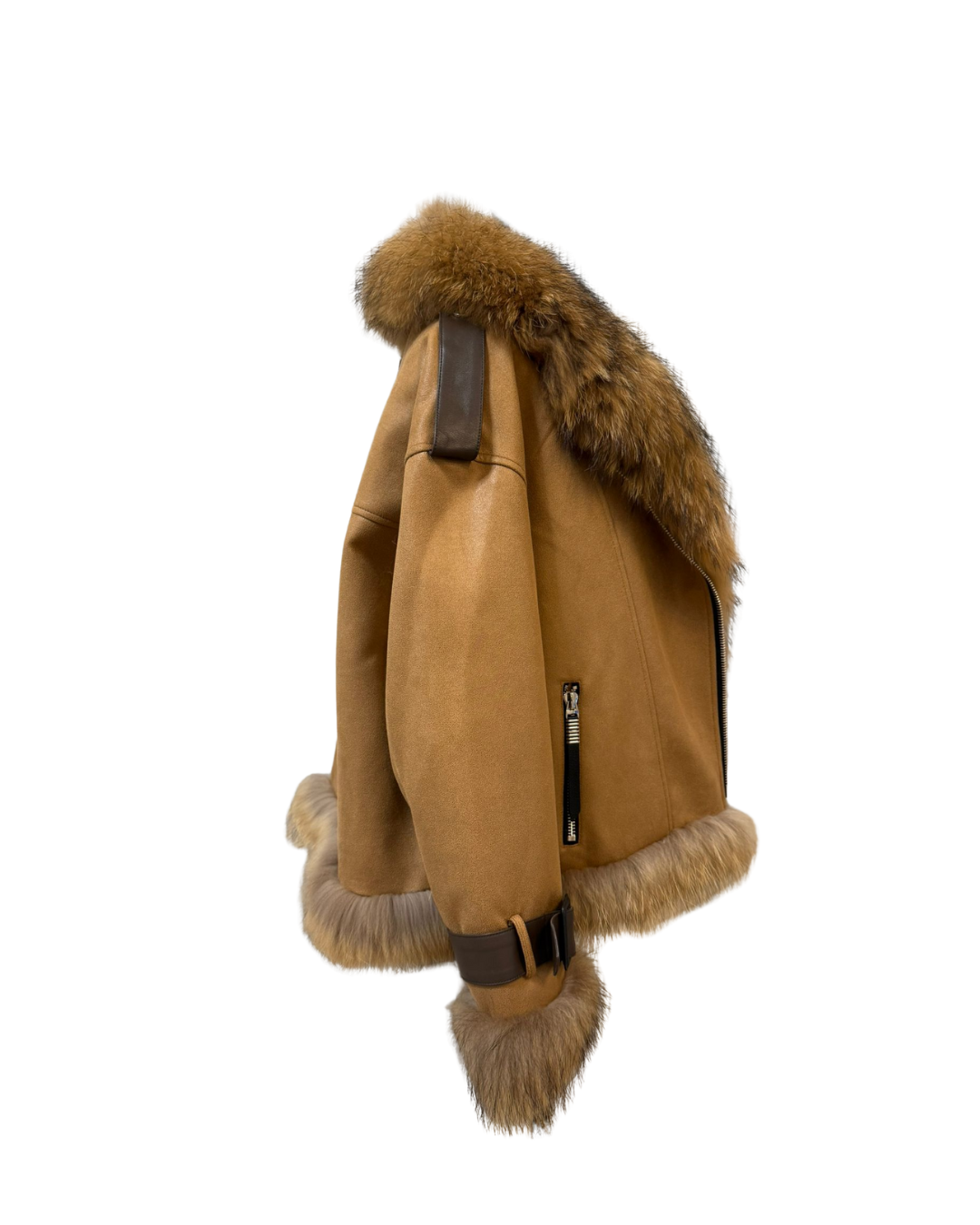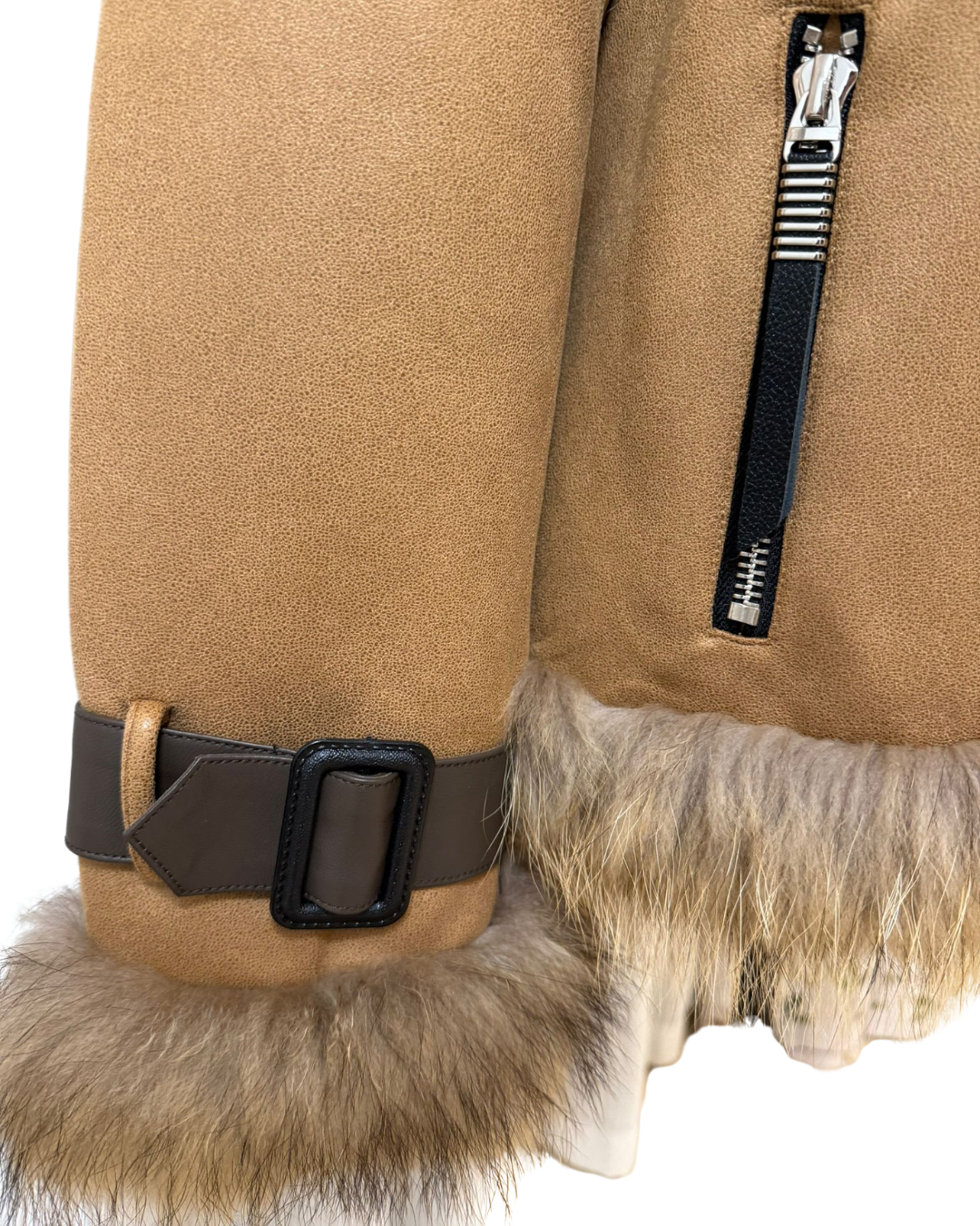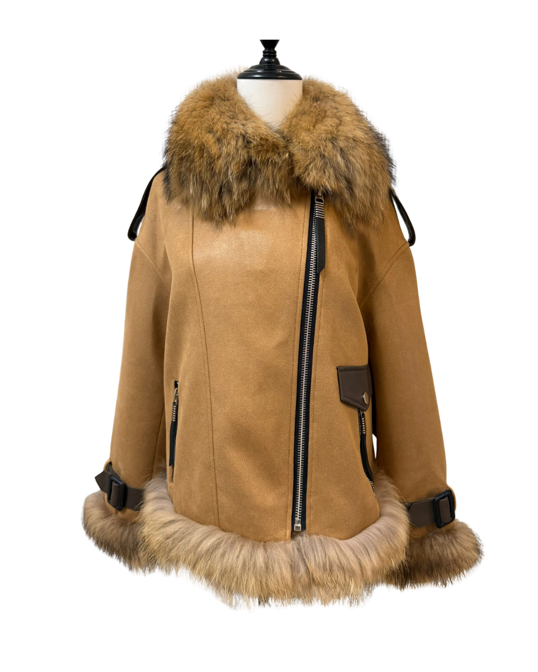 這是一件配備大貉子毛領的白鵝絨外套,採用全定位白鵝絨填充,並配有綿羊皮肩帶與手帶。它的胸圍為 100cm,長度 66cm,肩寬 43cm,袖長 55cm,重量 0.98 公斤。整體設計時尚保暖,毛領奢華大氣,羊皮配件增添質感,是冬日禦寒又能展現時尚品味的優質選擇。