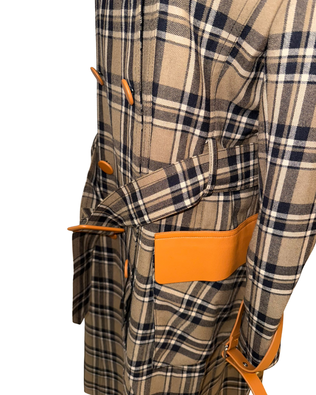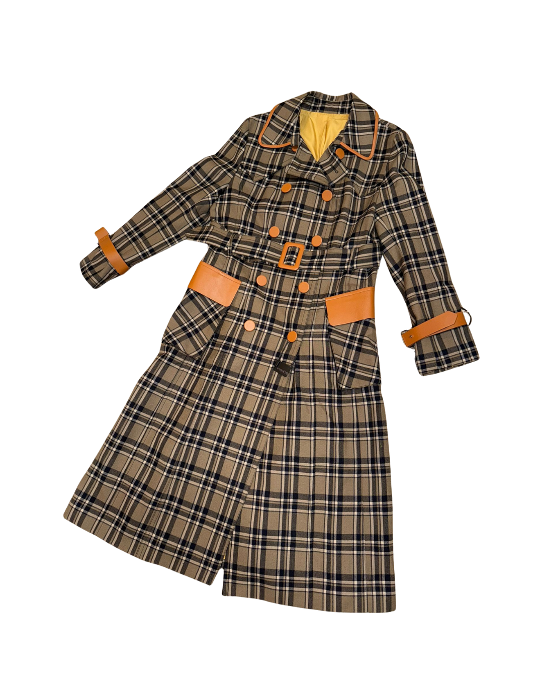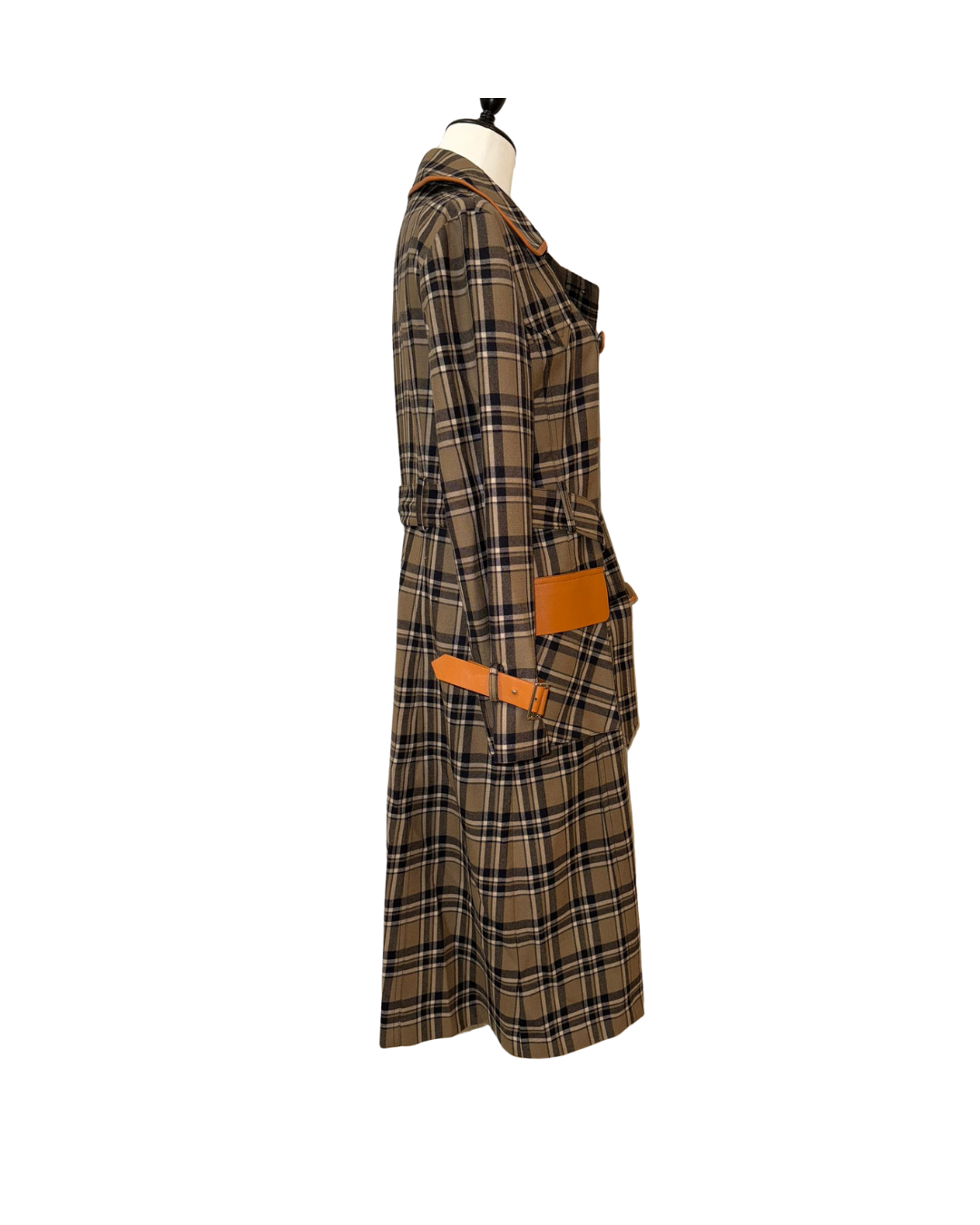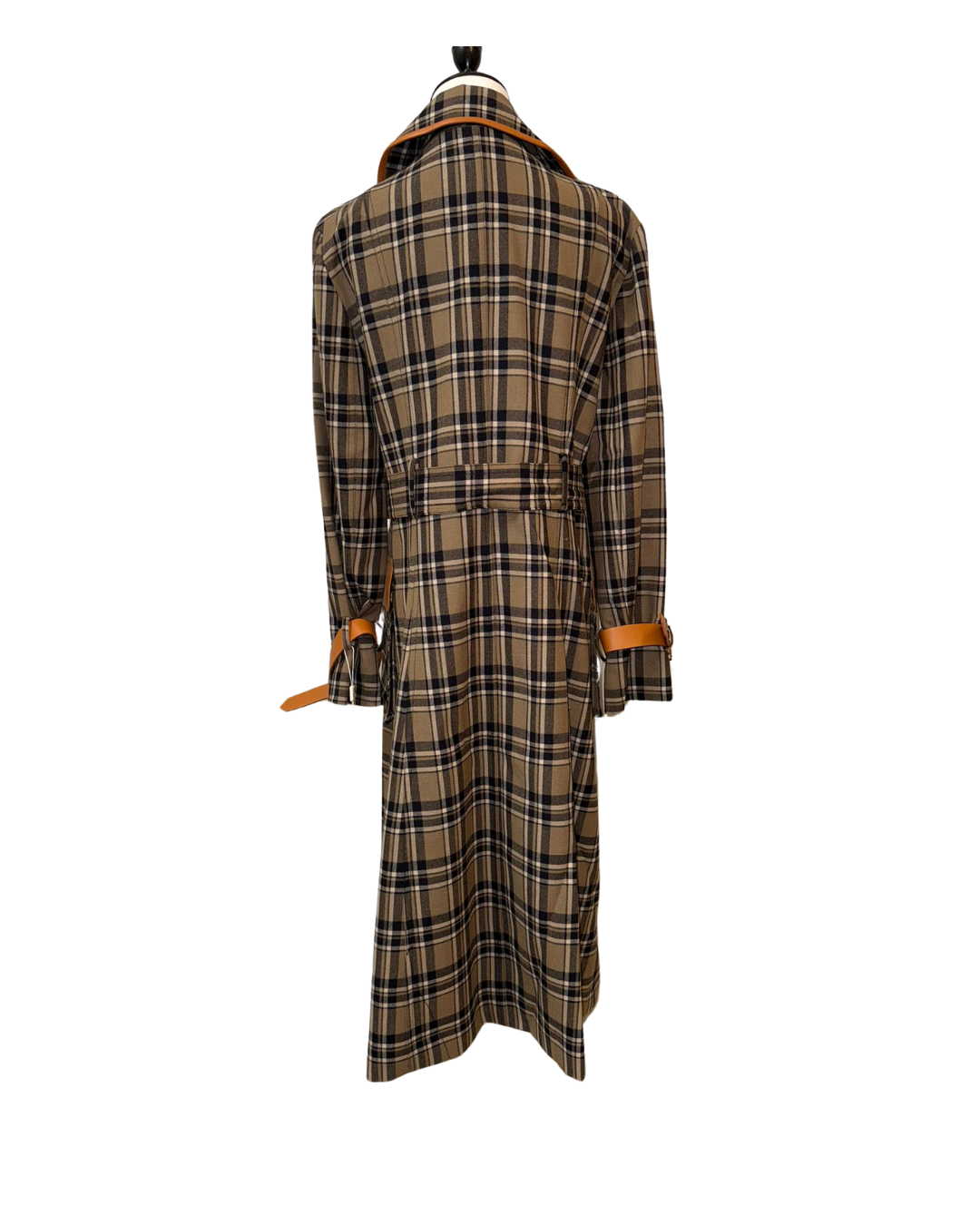 格紋羊毛長風衣 皮扣點綴顯精緻