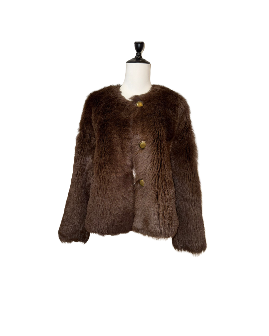 秋冬必備:這款奢華的托斯卡納羊皮皮毛一體夾克!採用高品質的直毛托斯卡納羊皮製成,質地蓬鬆柔軟,提供出色的保暖性與舒適度。濃郁的棕色調賦予它永恆優雅的外觀,而金色鈕扣則增添了一絲精緻感。