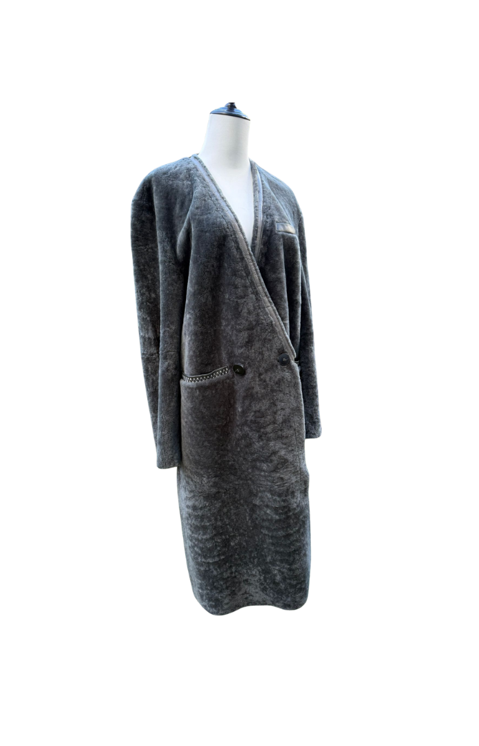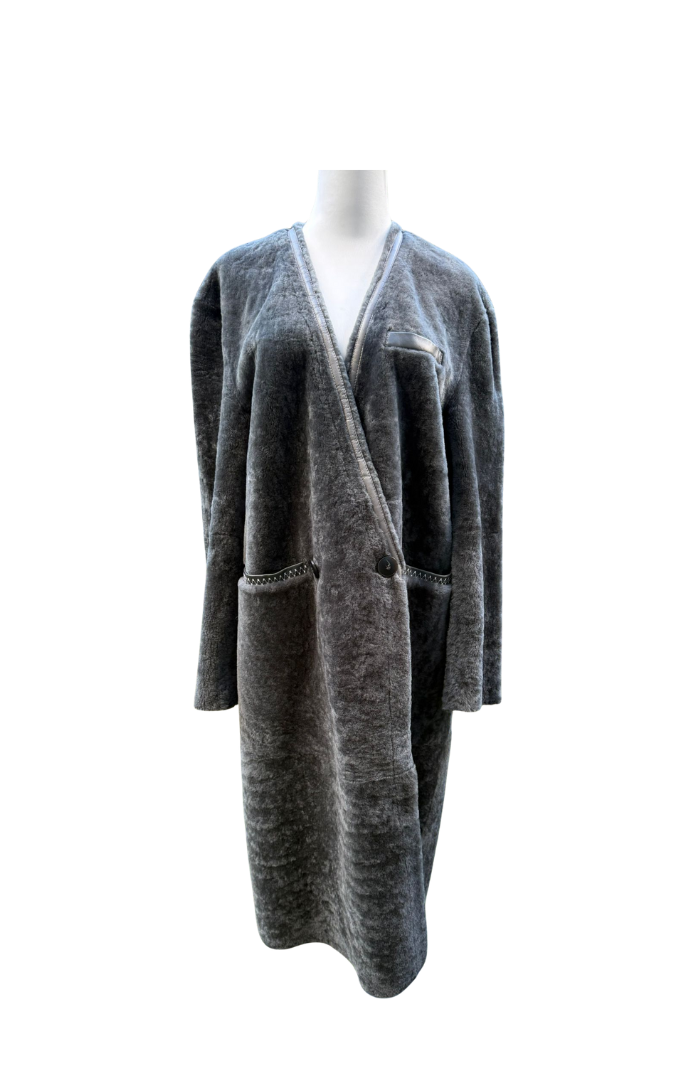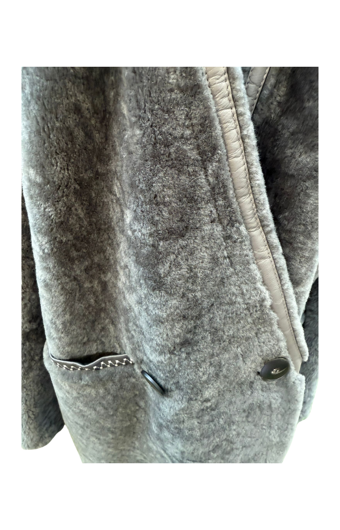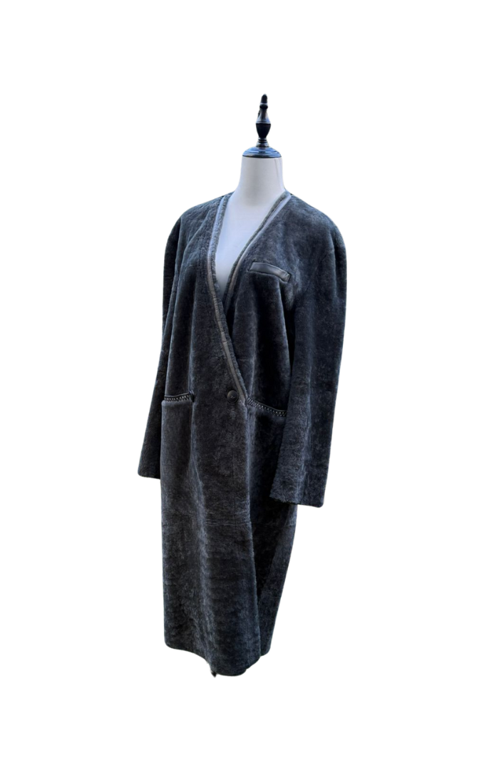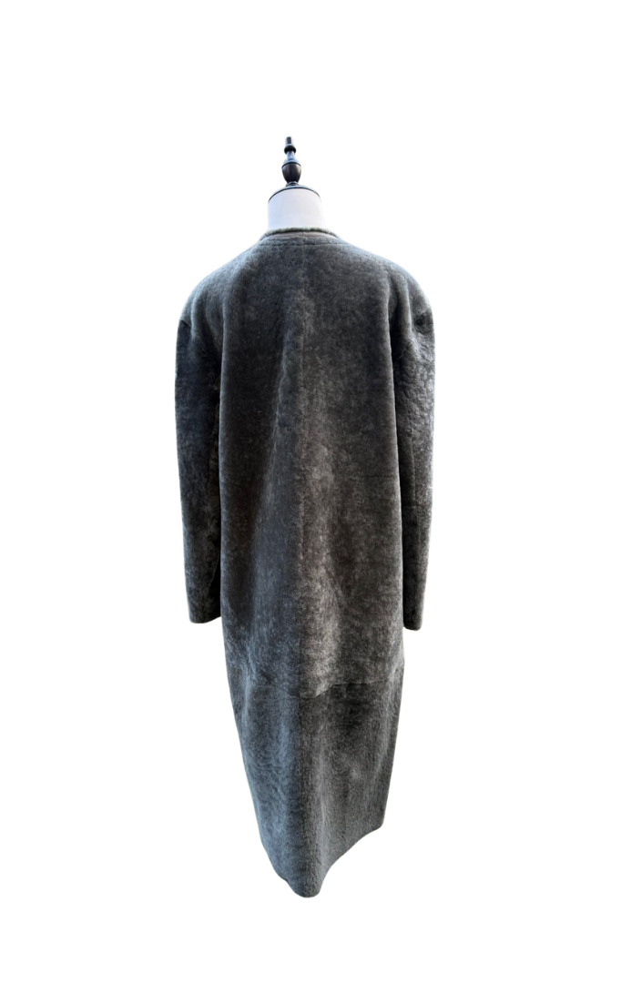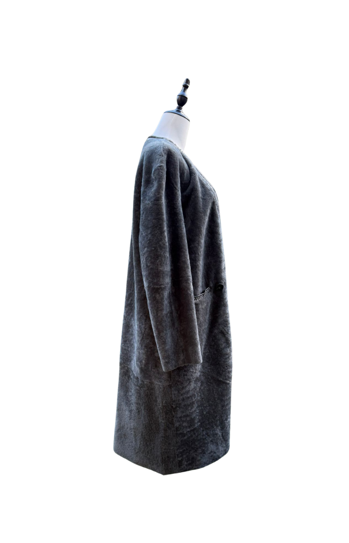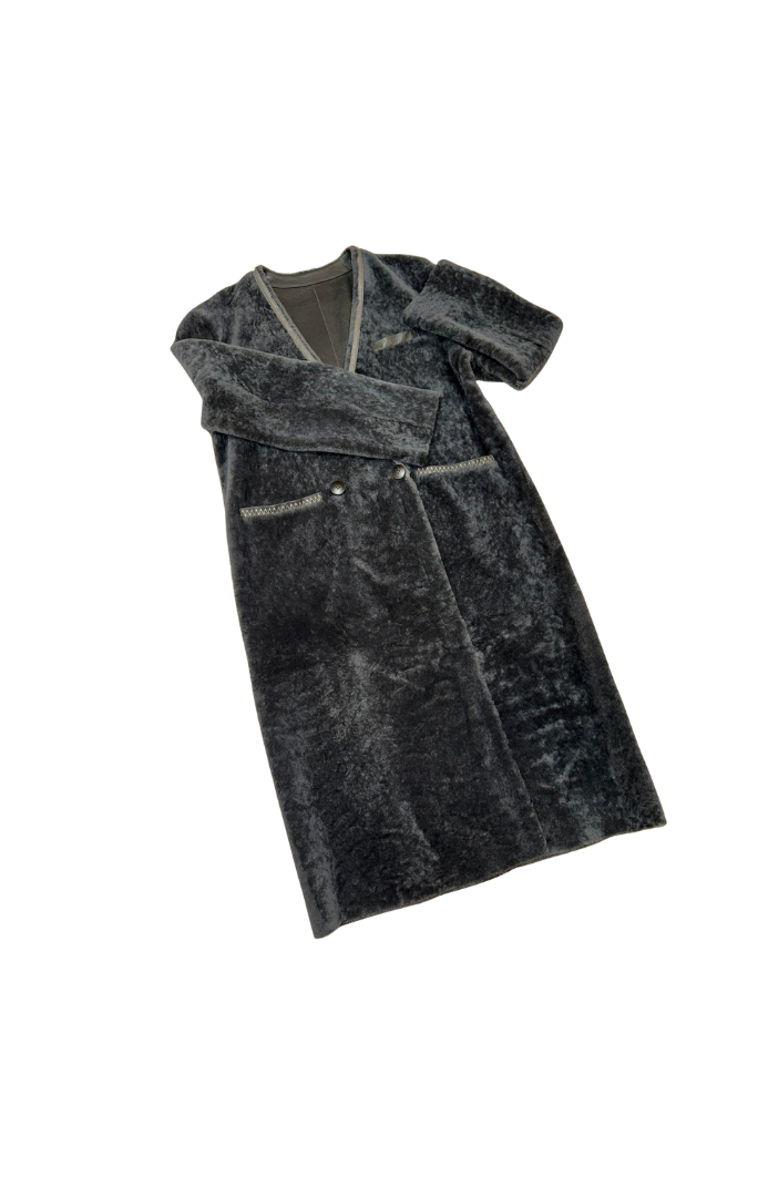 這是一件深灰色皮毛一體大衣,採用經典長款設計,盡顯優雅大氣。V 領剪裁修飾頸部線條,搭配精緻紐扣,簡約又不失細節感。衣身以柔軟毛絨面料打造,觸感舒適且保暖性佳,內裏皮革材質,提升質感與耐用性。口袋處的皮革裝飾與縫線設計,爲整體增添精緻感,無論是日常出街還是正式場合,都能輕鬆駕馭,是秋冬季節兼具時尚與實用的穿搭好物!