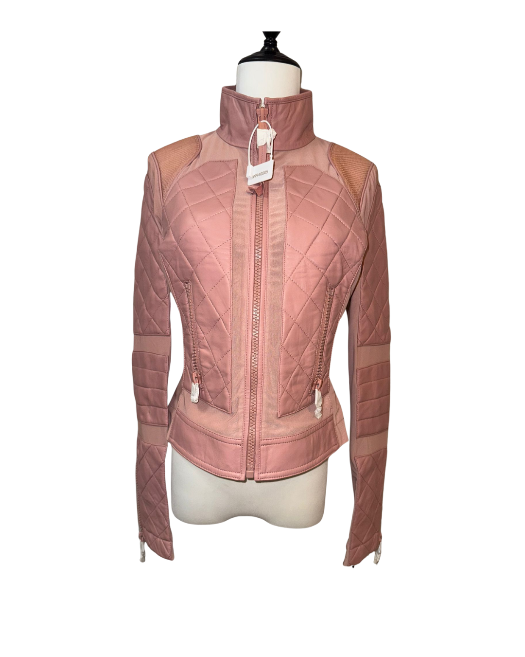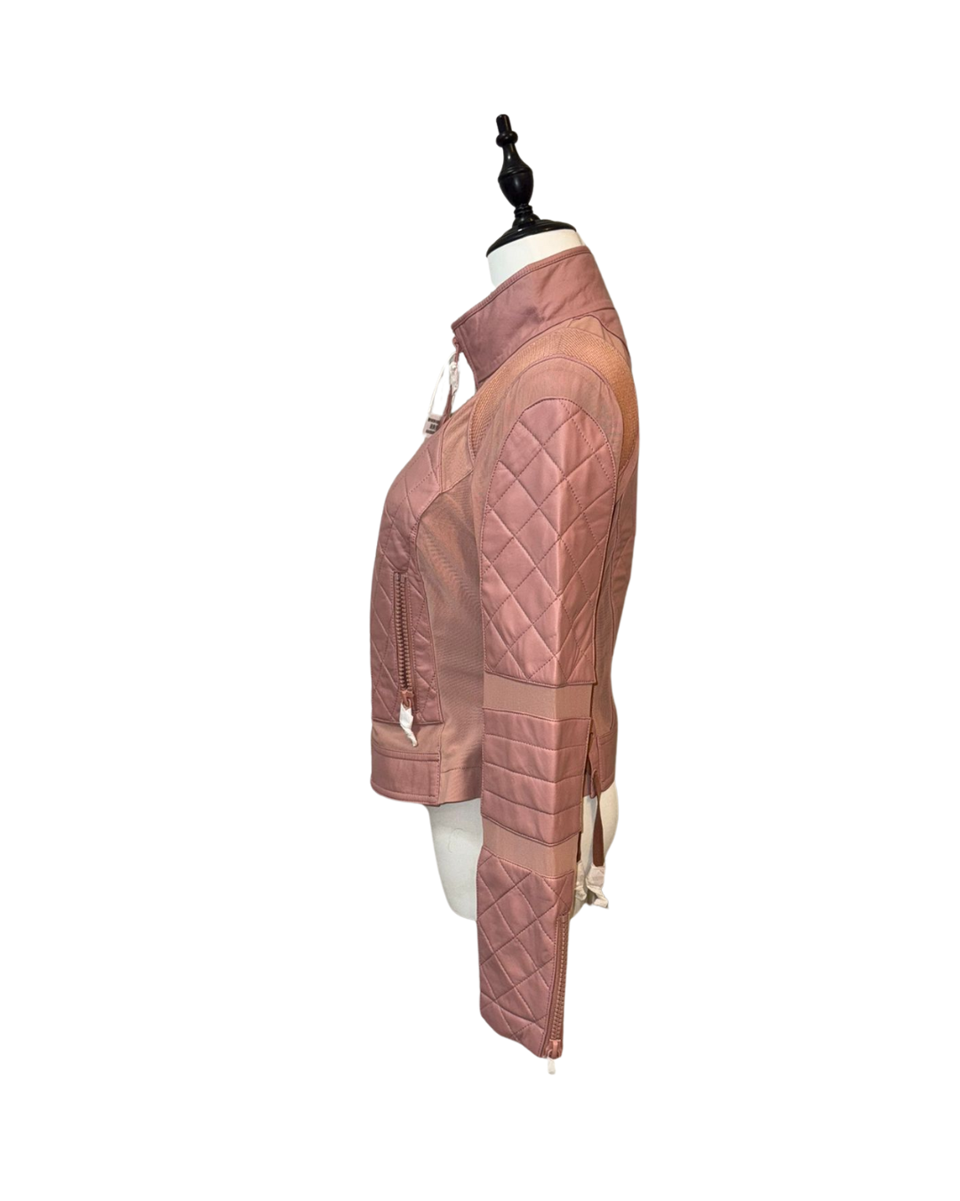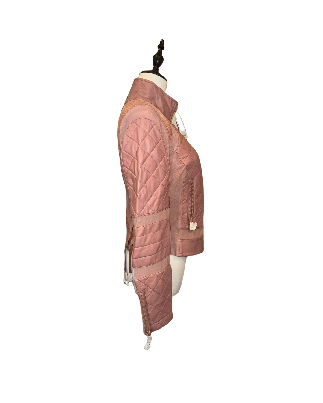 秋冬必備:這款時尚的粉色絎縫夾克!憑藉其時尚的絎縫圖案和別緻的設計,兼具時尚與實用性。高領設計提供額外保暖,前襟拉鍊便於穿脫。短款設計增添潮流感,非常適合與各種下裝搭配。